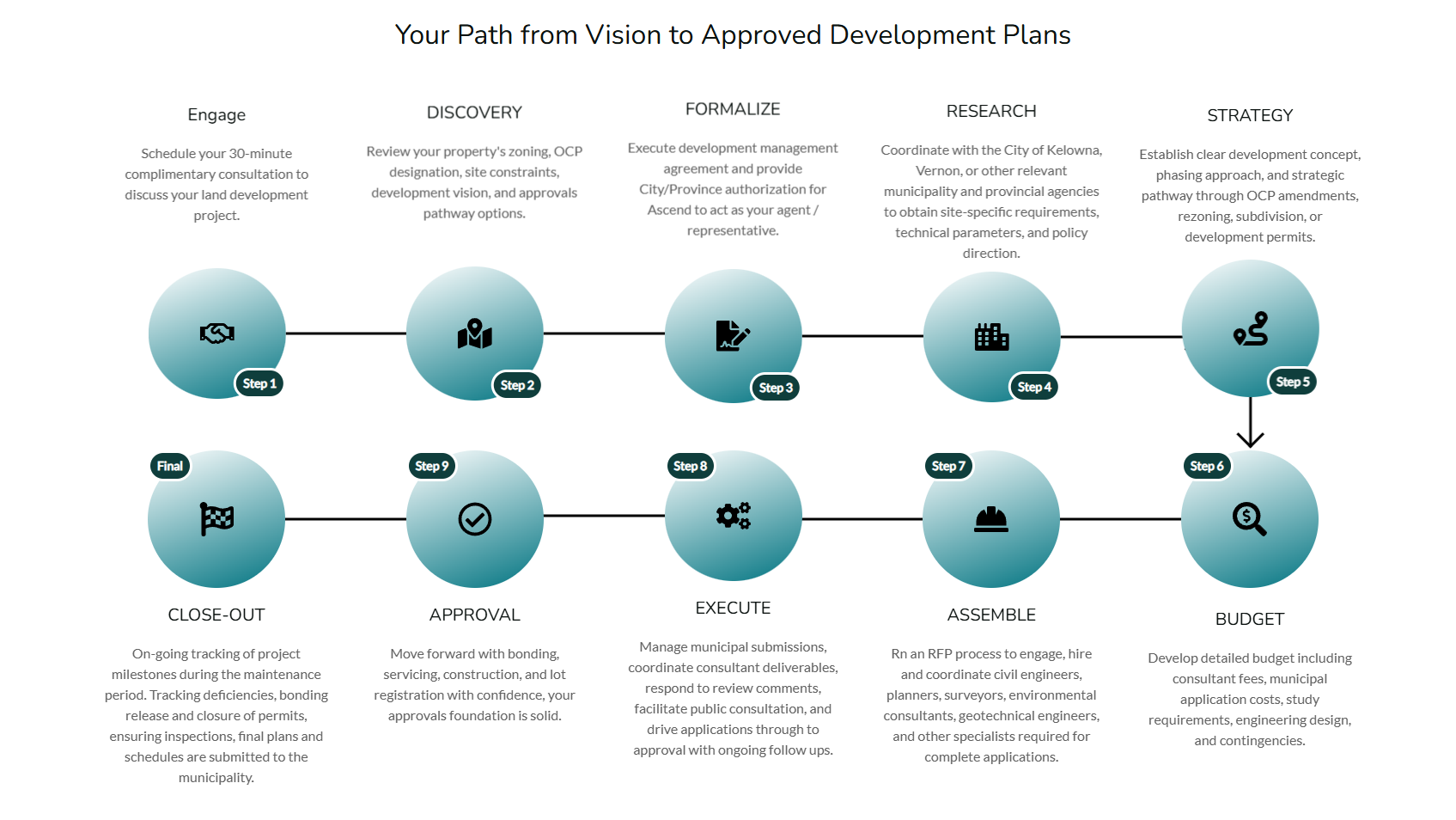 Ascend Development Partners provides development management, project management, and development approvals support for land development projects in the Okanagan and across British Columbia. Backed by our experience in development approvals and front-end project coordination, we help position your project for success from the very first submission.